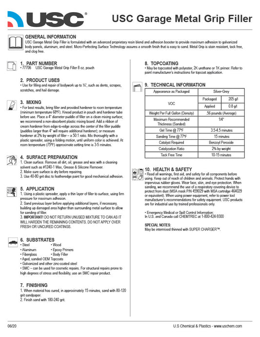 USC® 77706 Metal Grip Filler – 8 oz Pouch, Silver-Gray, Liquid (High-Adhesion for Aluminum, Steel & Fiberglass)