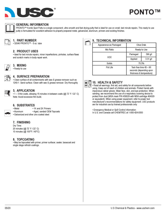USC® PRONTO™ 32046 Kombi Spot Putty – 5 oz Tube, Olive Drab, Single-Component Air Dry Putty