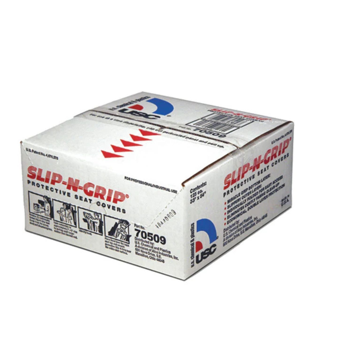 Keep vehicle interiors spotless with USC® Slip-N-Grip® Protective Seat Covers. Featuring a unique double-layer design, these seat covers provide maximum protection against dirt, grease, and spills while maintaining strength and durability. Each cover is individually folded for easy dispensing and use, making them a professional shop essential. Sold in a box of 125 covers, they’re ideal for repair, refinishing, and detailing environments where protecting the customer’s vehicle is a priority.